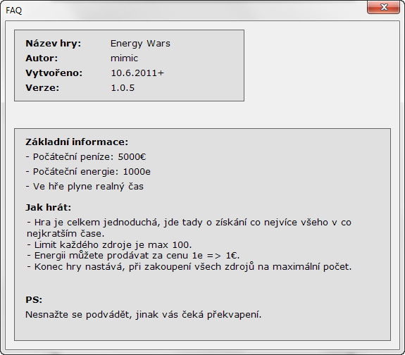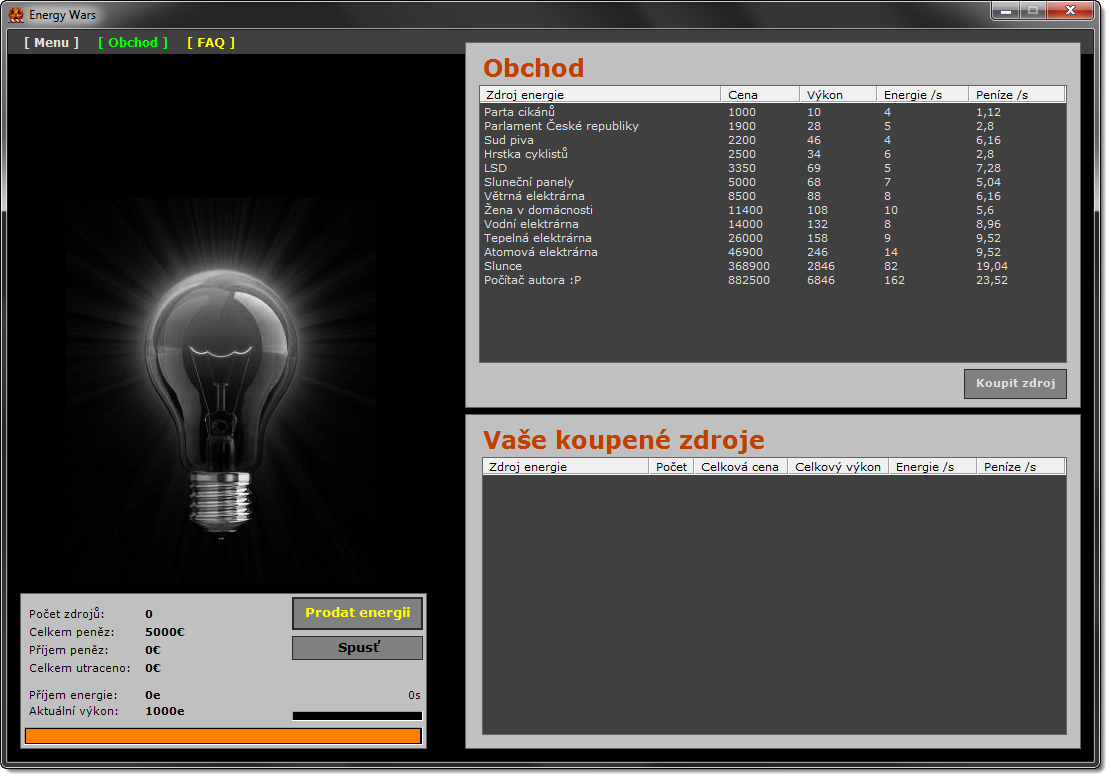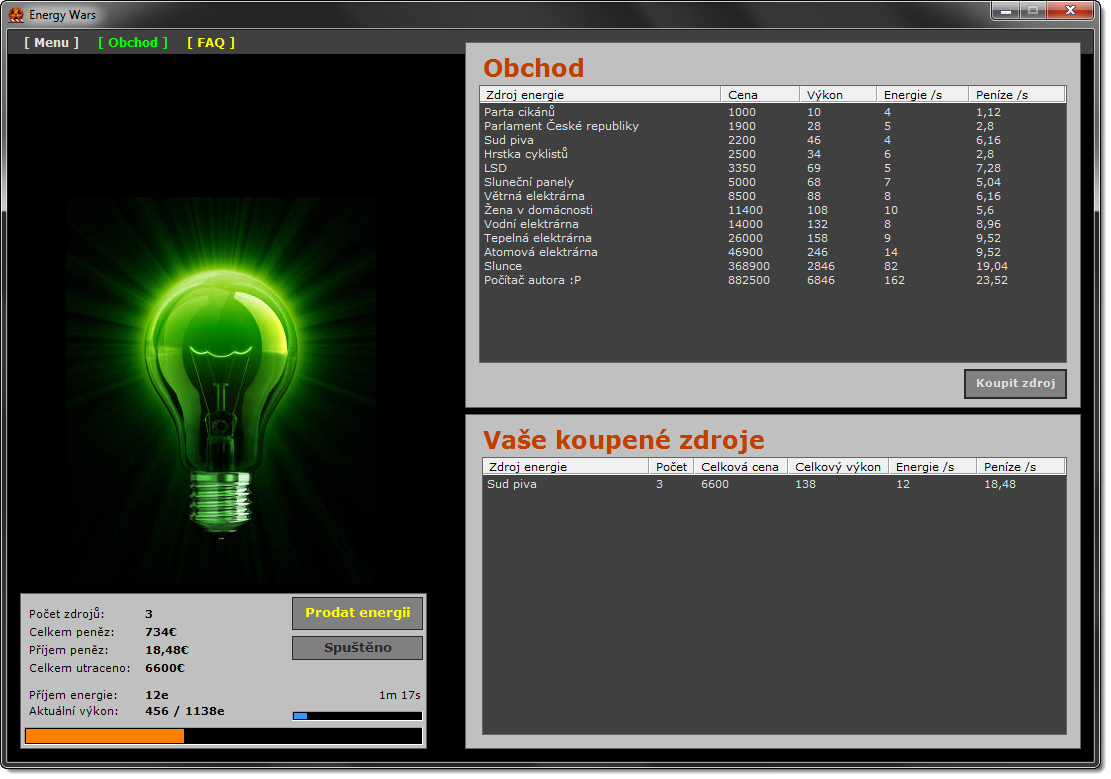 - Je to taková klikačka, ale jednou jsem na netu viděl něco na podobnej způsob, kde se kupovala energie a tak rostl výkon elektrárny. Takže jsem udělal něco v mém stylu, jen jsem všechno vylepšil a přidal více věcí
